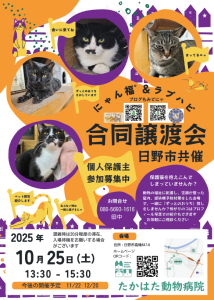 2月22日(土) に 第14回 保護ねこ譲渡会を開催いたします。 こんにちは、たかはた動物病院です。 2月の保護ねこ譲渡会のお知らせです。 2月22日(土)13:30~15:30 に第13回 保護ねこ譲渡会を開催 […]